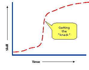 A "knack" is a psychomotor equivalent of cognitive "insight": the best example is probably learning to ride a bicycle. The learning "curve" (where x=time and y=skill) is more like a single step. The learning happens in a few moments, and is permanent—although it may have taken a long time to get to that step with little seeming progress.